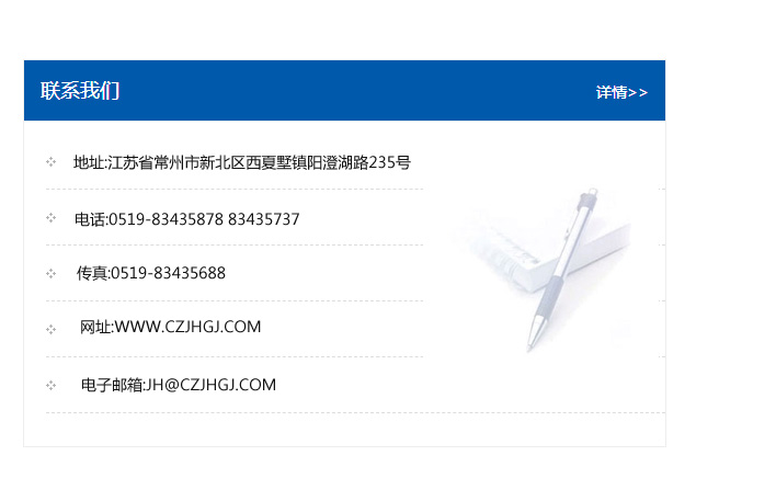 傳真:0519-83435688    郵編:213135    網(wǎng)址:WWW.czjhgj_com.hnczjl.com    電子郵箱:JH@czjhgj_com.hnczjl.com